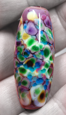 It gives dramatically different looks as shown above over Effetre Violet, on black with silver foil, and over translucent and opaque white.